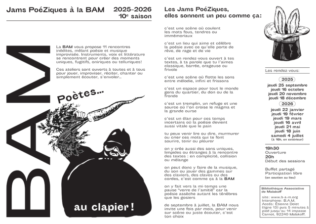 Les jams poéZiques repartent pour un tour de planète. Poètes au clapier ! Pas si sûr… car le lapin d’Alice se méfie des coups de carottes OGM et il a plus d’un verbe dans son sac pour sortir du chapeau de MOTAMO, le terrible sorcier-politicien à la langue fourchue.