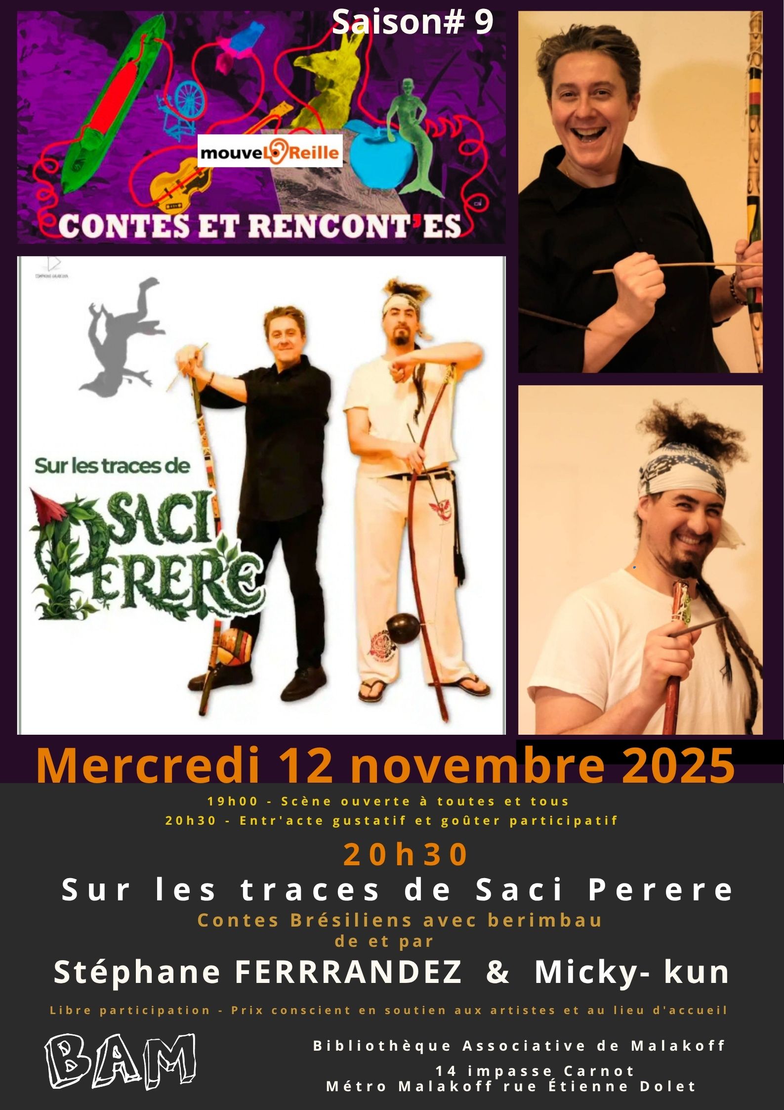 20h30 – Spectacle/racontée – Sur les traces de Saci Perere de et par Stéphane FERRANDEZ accompagné de Micky-Kun. Les histoires ainsi que propos et thématique de cette création contée s’adressent à un public ado-adultes