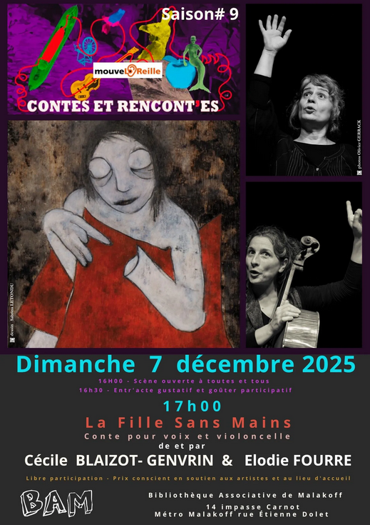 Un voyage dans le merveilleux, sombre et lumineux revisité par la conteuse Cécile Blaizot-Genvrin et mis en musique par Élodie Fourré pour ce magnifique conte initiatique. Une relecture en duo, voix et cordes du conte original la Jeune fille sans mains, par la compagnie M’O nous venant de Normandie !