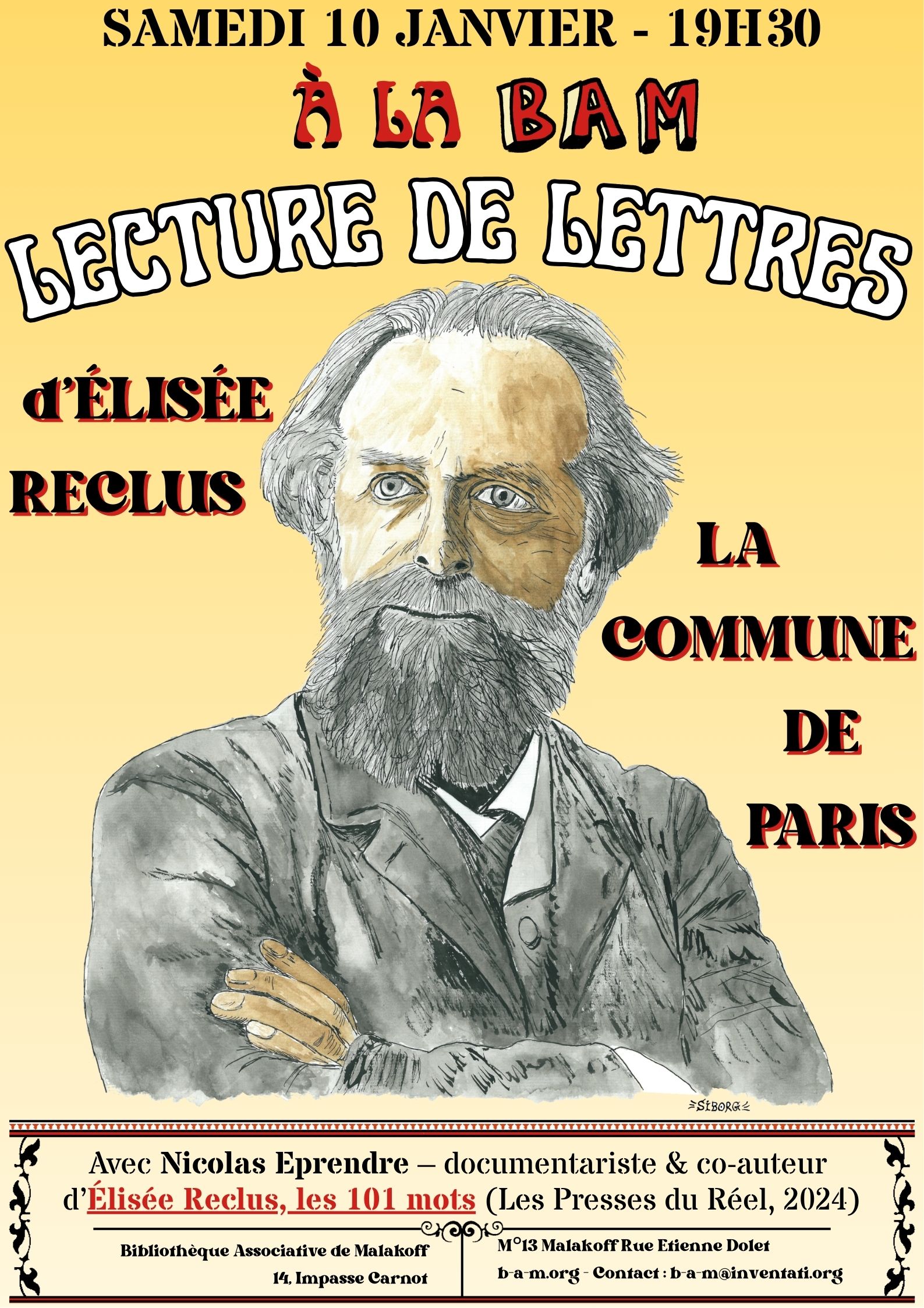 À partir de 19h30 : lecture de la correspondance d’Élisée Reclus à propos de la Commune de Paris. En présence de Nicolas Eprendre, réalisateur documentariste et co-auteur du livre abécédaire Élisée Reclus, les 101 mots, paru en 2024 aux Presses du Réel.