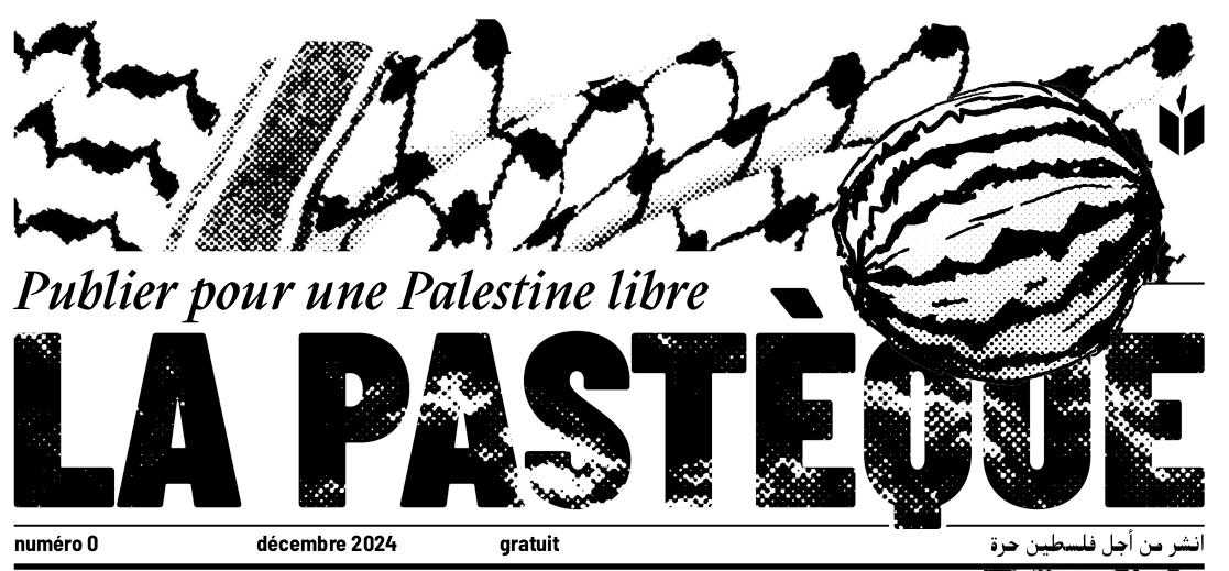 Dans un deuxième temps aura lieu une présentation et un arpentage du journal gratuit La Pastèque, édité par Publishers for Palestine France (voir aussi la présentation sur le site des éditions Syllepse). La Pastèque publie des numéros thématiques sur la Palestine et Gaza : le numéro 0 sur le rôle des bibliothèques ; le numéro 1 sur le désastre écologique qu’a représenté la Nakba, ainsi que la guerre environnementale (herbicide) menée actuellement à Gaza. Une place importante est réservée dans le journal à la publication de poèmes palestiniens, qui seront lus durant l’arpentage.