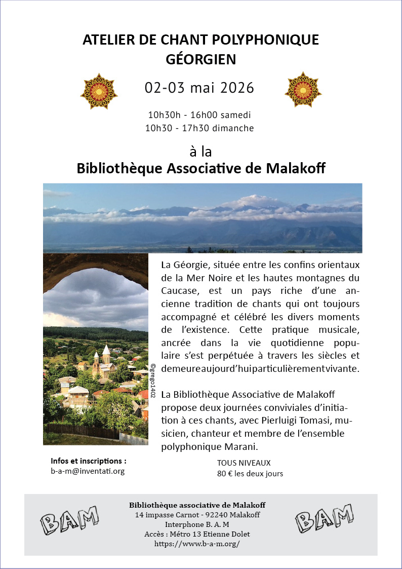 – Dimanche 3 mai 2026 : Début de l’atelier – 10h30 (accueil 10h), fin -17h.30